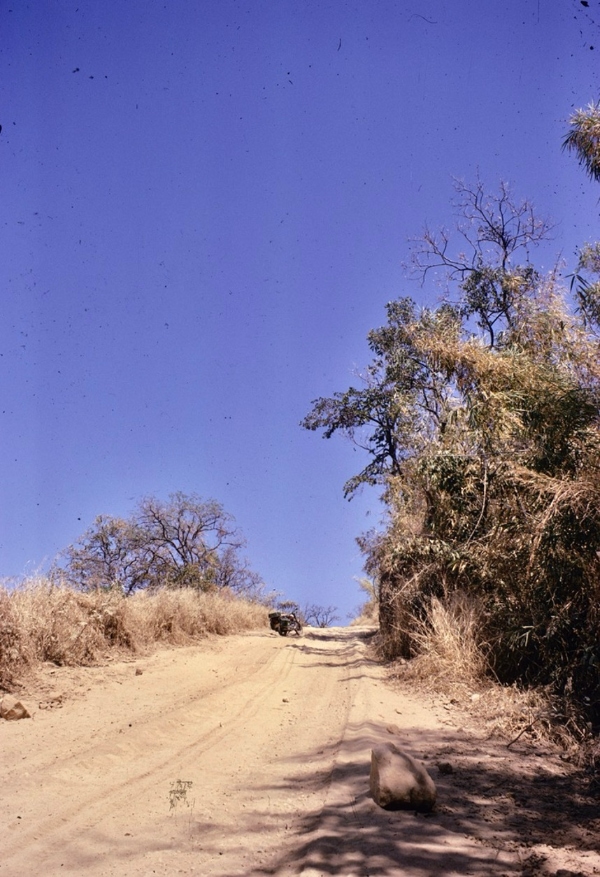 In Gedaref police station (why did I go there? Heaven knows) I met an African refugee from Rhodesia. He said the police at Doka were nice, so when I get to Doka after seven or eight hours driving, I accept the chance to stop honourably. From Doka next day, to all the other hazards are added steep inclines covered in loose rocks. It’s important to remember that these are not consistent hazards. Anything can happen at any moment. It is dangerous to take one’s eye off the road for an instant. I have gone over twice now, not through lack of attention but through taking the wrong line and being caught in converging ruts or in a bad bit of rock. So I am ready for anything and still dreading it. Even inventing impossible hazards for myself, only to see them realised. The impossible ford, the rocky path along a ravine, etc.