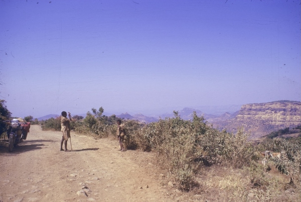 Park the bike and walk back down, contemplate the loss of what? Can’t even remember which box is lost, what’s gone? The cameras? Every potential or actual disaster finds me more philosophical. Hear distant voices and engine. Some people have found the box. What are they doing with it? What a way to put Ethiopian honesty to the test! A little further down meet the truck coming up. They are enormous lorries, climbing so slowly, loaded with sacks of grain or cotton. It stops. The driver points to his left. I assume he means he has seen the box. No, he has it there in the cab. I climb in, with helmet and goggles and ride back up to the bike. It is the box with food, torch, washbag, etc.