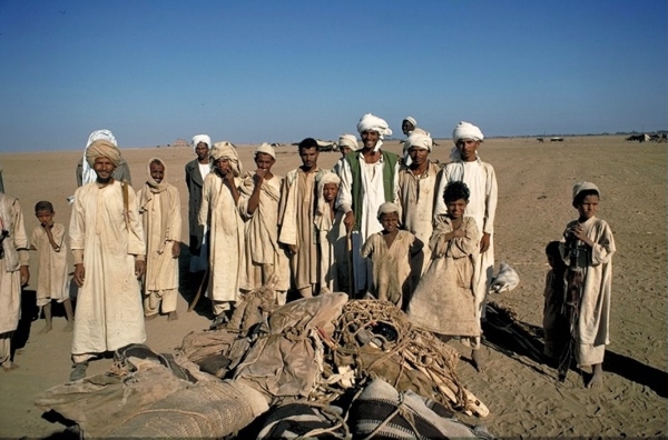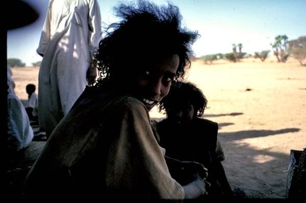 At last, there was a bus. Bus arrived at 11.30pm. Ford chassis. Heavy riveted steel body built in Khartoum. Out tumbled horde of people. Many with swords. Scabbards shaped like paddles. Crucifix grips. They are a tribe called Bescharyin. From Sedon until Goz Regeb. Most are nomads. Their hair is long and the strands are glued together with oil, called oudak – animal grease, and wear an ornamental curved stick used as a comb, sticking out like an Indian feather, but horizontally. They wear a waistcoat, galabeia, and trousers with crutch below the knees and tied by cord. Three-tiered clothing. All fell to the ground and slept until 4am. I was happy to sleep too, but it got cold and I had no cover. At 4am the bus left for Atbara. Very bumpy. Much coughing. A sort of stale, damp smell. Two B in front of me, hair dangling before my eyes. No expression. Very stern. After dawn people began getting off. Outside Atbara, my companion, the merchant, vanished mysteriously [while I slept.] A family of B’s descended, a pathetic huddle of humanity set down on the sand, with their bundles of mats, sticks, pots and bags, still cold, kids bare chested. They appeared momentarily unable to cope at all.
