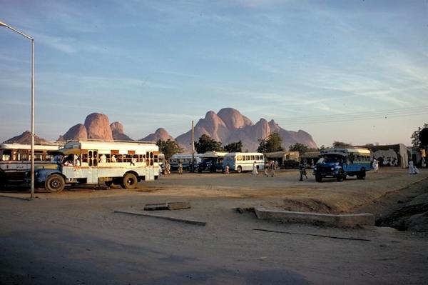 [After two days at the school I learned there was a bus back to Atbara. I was introduced to a merchant who was also taking the bus and with my five-gallon jerrycan I accompanied him to Sedon where the bus stopped in the night. He spoke no English at all. We lay on the sand in the smpty square to wait.]