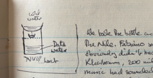 We took the bottle and walked across cultivated ground to look at the Nile. Fabiano said the White Nile was a day’s walk away. He obviously didn’t know the Blue Nile only joins the White Nile at Khartoum, 200 miles further south. We walked back to place where music had sounded. Fabian was dodging about looking into bushes, in the manner of Don Genero looking for cars.