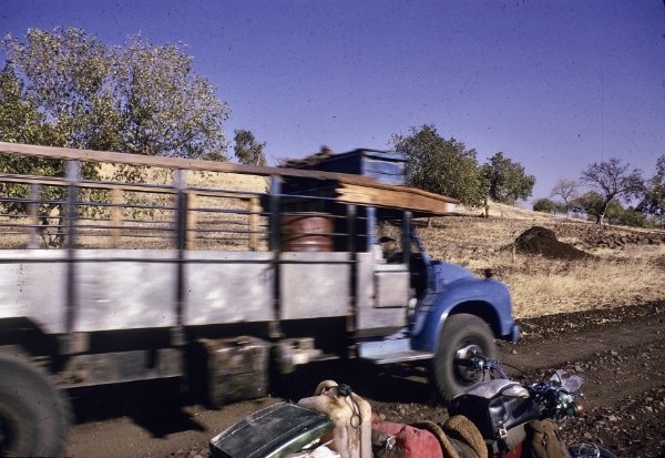 Go for a walk to watch road construction. They’re filling in a “wadi” over a concrete spillway. Huge Caterpillar earth movers, swinging around like bumper cars. They grade as they tip. Back to hotel where Vassi Fissaha, the Ethiopian civil engineer working on the road, is waiting to leave for Moyale. He is very fat with a round face, becomes interested as we talk. Says I could get to Moyale that day, road isn’t so bad. He’s going in his VW Moke, expects to be there 5.30 to 6. Mega already seems exhausted for me. I accept the challenge. Meet American from Nairobi, Geoff Probitts, coming into Mega on a Honda 350. First encounter.