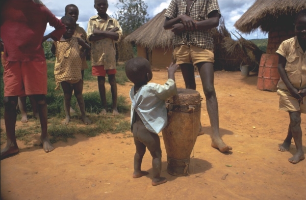 Drum about two feet tall, beautiful sound. Pot cooking on fire in kitchen hut.
