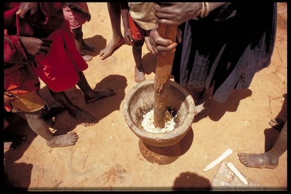 Mortar for grinding up maize with sprinkling of water. Has a narrower depression at the bottom into which stick [pestle] fits.