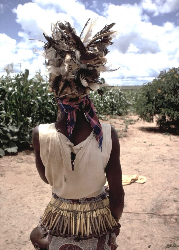Tallest of wives and most elegant produces dancing gear made of strung bottle tops and a hat made of paper and feathers.
