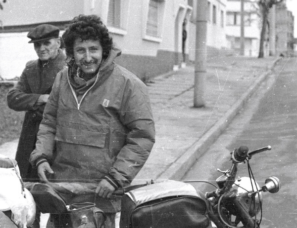 The first problem was the conventional one – of lifting four cwt down three feet, then to manoeuver it through a narrow passage packed with camel drivers in a terrible hurry. While manoeuvering it round a sharp corner all I lost was one pannier. It was just a matter of persistence. But the final crossing [to the other boat] was inconceivable. Both ships had steel-sided gangways, with openings only wide enough for a person, and the openings did not coincide either with each other or with the end of the passage. The bike had to be manoeuvered through a Z-shaped path, in mid-air at an angle of 30 degrees pointing downwards across three feet of water.
