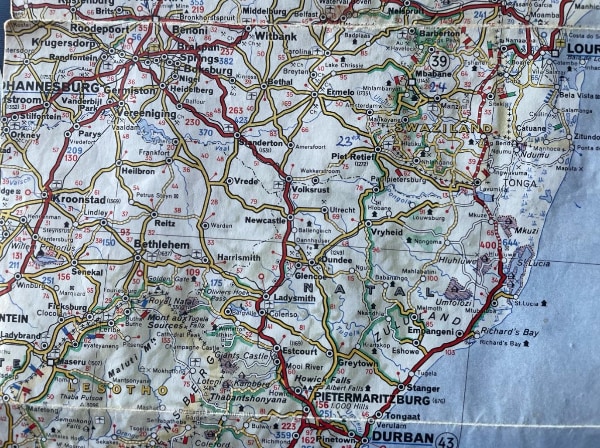 [Here’s a section of the only map I had at the time – one of the three maps by Michelin that covered the whole of Africa, so the scale is huge. You can just spot Nelspruit at the top, on the road from Jo’burg to Lourenço Marques. But I dipped down into Swaziland on my way to visit Anthony’s sister, “Small”]